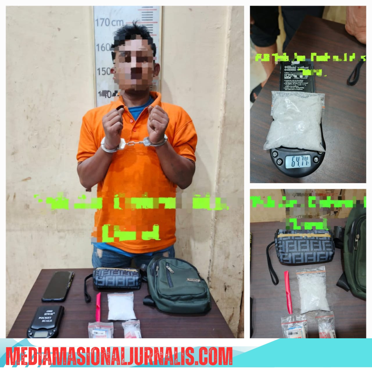 Dari hasil penggeledahan, petugas menemukan barang bukti berupa 1 bungkus plastik klip bening besar berisi narkotika jenis sabu dengan berat brutto 64,74 gram yang disimpan di dalam tas sandang warna hijau di kamar tersangka.
