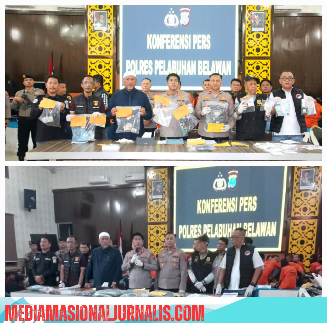 Kapolres Pelabuhan Belawan AKBP Rosef Efendi, S.I.K., M.H., CPHR., memimpin langsung konferensi pers didampingi Wakapolres, para pejabat utama, serta jajaran Polsek. Kegiatan ini juga dihadiri tokoh masyarakat dan 53 insan pers dari berbagai media.